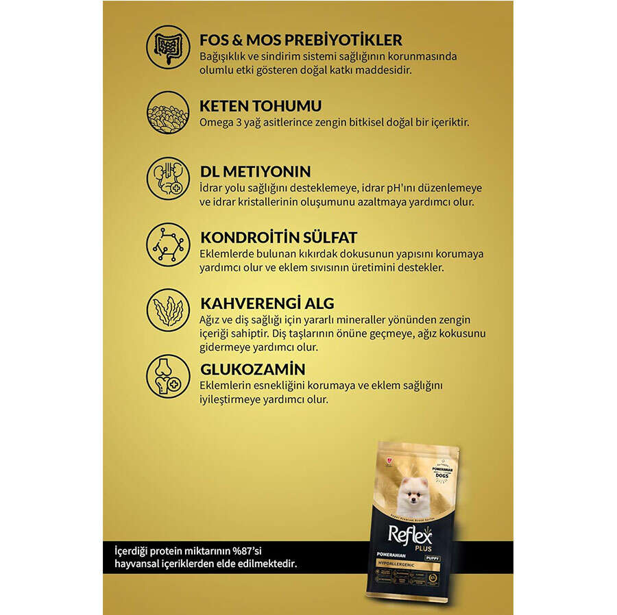2-10 aylık, Pomeranian ırkı yavru köpeklere uygun tam ve dengeli formüle edilmiş, süper premium kuru köpek mamasıdır.Bağışıklık ve sindirim sistemi sağlığının korunmasında olumlu etki gösteren doğal katkı maddesidir.