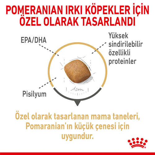 ROYAL CANIN Pomeranian Adult uyarlanmış mineral içeriği sayesinde köpeğinizin kemik ve eklem sağlığına katkıda bulunur. Bu formül köpeğinizin derisinin doğal bariyer görevini desteklemeye yardımcı olurken Pomeranian ırkı köpeğinizin göz alıcı tüylerini besler. Aynı zamanda içeriğinde bulunan yüksek sindirilebilirlikli proteinler sayesinde sindirim sistemi sağlığını destekler. Dengeli lif karışımı, sağlıklı bir bağırsak geçişi sağlar ve dışkı kalitesinin iyileştirilmesine destek olur. ROYAL CANIN Pomeranian Adult, Pomeranian ırkı köpeklerin çene yapısına uygun boyutta, dokuda ve yoğunlukta tasarlanmış mama taneleri içerir.