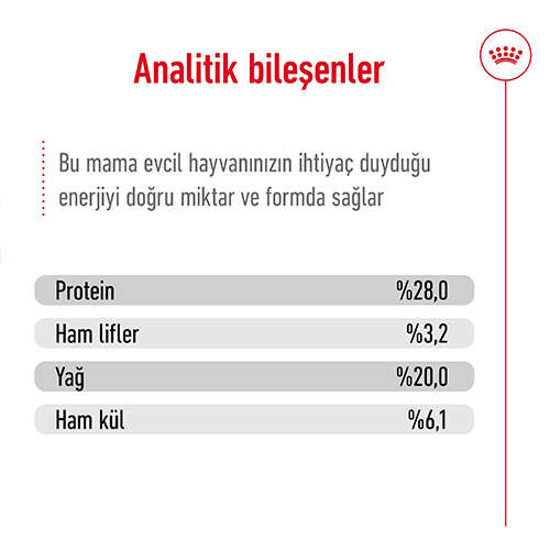 Analitik Bileşenler: Protein: 28.0% - Yağ miktarı: 20.0% - Ham kül: 5.3% - Ham lif: 1.8% - NFE: 36.9%