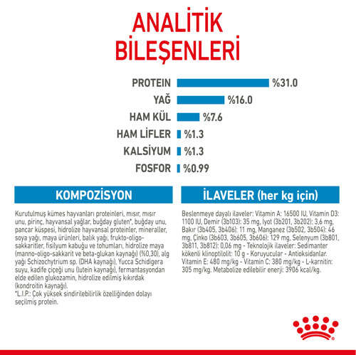 İÇİNDEKİLER : Kurutulmuş kümes hayvanları proteinleri, mısır, mısır unu, pirinç, birkisel protein izolat, hayvansal yağlar, buğday unu, pancar küspesi, hidrolize hayvansal proteinler, mineraller, balık yağı, soya yağı, mayalar ve ilgili parçalar, frukto-oligo-sakkaritler, fsilyum kabuğu ve tohumları, hidrolize maya (mannan-oligo-sakkarit kaynağı), maya ekstratları (beta- glukan kaynağı), kadife çiçeği özü (lutein kaynağı), hidrolize edilmiş kabuklu hayvanlar (glukozamin kaynağı), hidrolize edilmiş kıkırdak (kondroitin kaynağı).