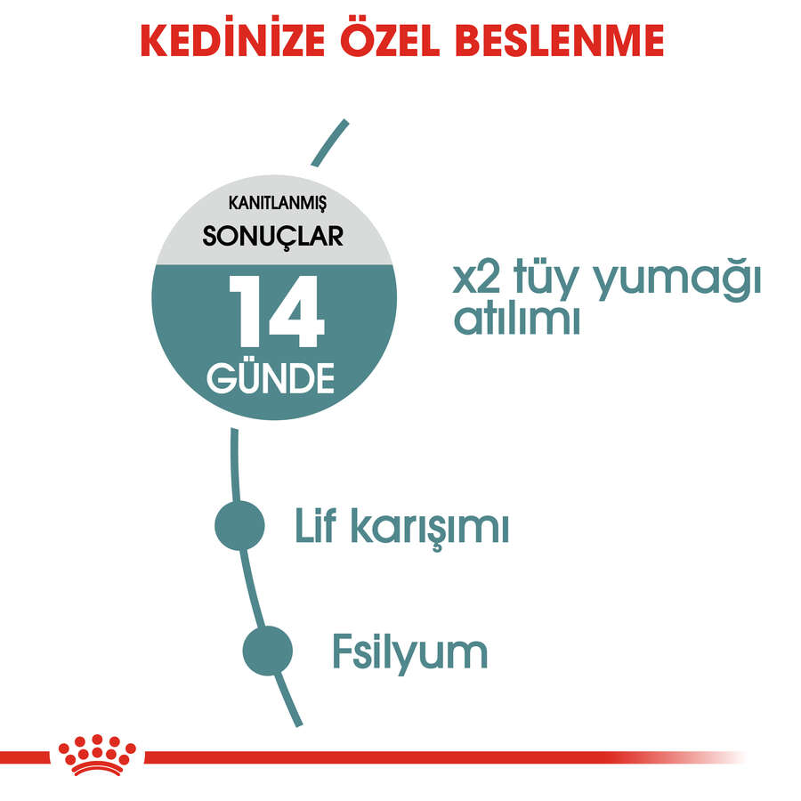 Kediler vakitlerinin %30'unu yalanıp temizlenerek geçirir. Bu yalanma seansları sırasında dökülen tüylerin ⅔'e varan oranı yutulur ve sindirim kanalında tüy yumakları oluşur. Doğru beslenme tüy yumaklarını azaltabilir ve sağlıklı sindirimi destekler. İç mekanda yaşayan, tüy yumaklarına yatkın, 1 ila 10 yaş arası yetişkin kedilere yöneliktir.