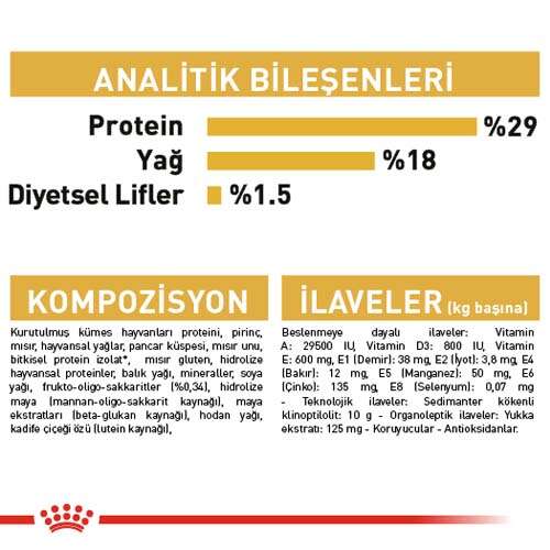 İÇİNDEKİLER : Kurutulmuş kümes hayvanları proteini, pirinç, mısır, hayvansal yağlar, pancar küspesi, mısır unu, bitkisel protein izolat, mısır gluten, hidrolize hayvansal proteinler, balık yağı, mineraller, soya yağı, frukto-oligo-sakkaritler (%0,34), hidrolize maya (mannan-oligo-sakkarit kaynağı), maya ekstratları (beta-glukan kaynağı), hodan yağı, kadife çiçeği özü (lutein kaynağı).