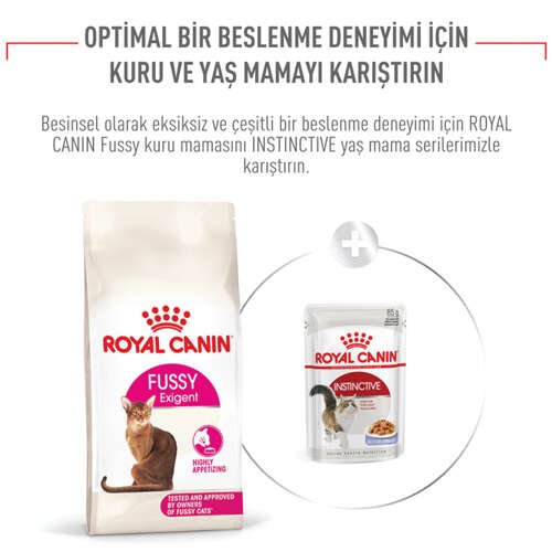 ROYAL CANIN® Fussy, her şeye “hayır” diyen kediler için özel olarak tasarlanmış, yüksek lezzetliliğe sahip ürün serimizdir. Seçici kedileri beslemek zor olabilir; bu nedenle etkili formülümüz basit bir çözüm sunar. Bu özel diyet, dengeli besin içeriğiyle birlikte aromaların özel bir kombinasyonu ve çıtır mama dokusuyla yüksek iştah uyandırır. Enerji açısından yoğun ve protein bakımından zengin olan ROYAL CANIN® Fussy, az miktarda ama seçici şekilde beslenen yetişkin kediler için idealdir ve sağlıklı kilo kontrolünü destekler.Yeni formül, %40 oranında yüksek protein içeriğiyle seçici kedilerin tokluk hissini korumasına yardımcı olur. Ayrıca idrar yolu sağlığını destekler ve kısırlaştırılmış kediler için de uygundur.