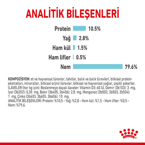 Bileşimi: Et ve hayvansal türevler, tahıllar, mineraller, bitkisel protein özleri, bitkisel kökenli türevler, sıvı ve katı yağlar, çeşitli şekerler.