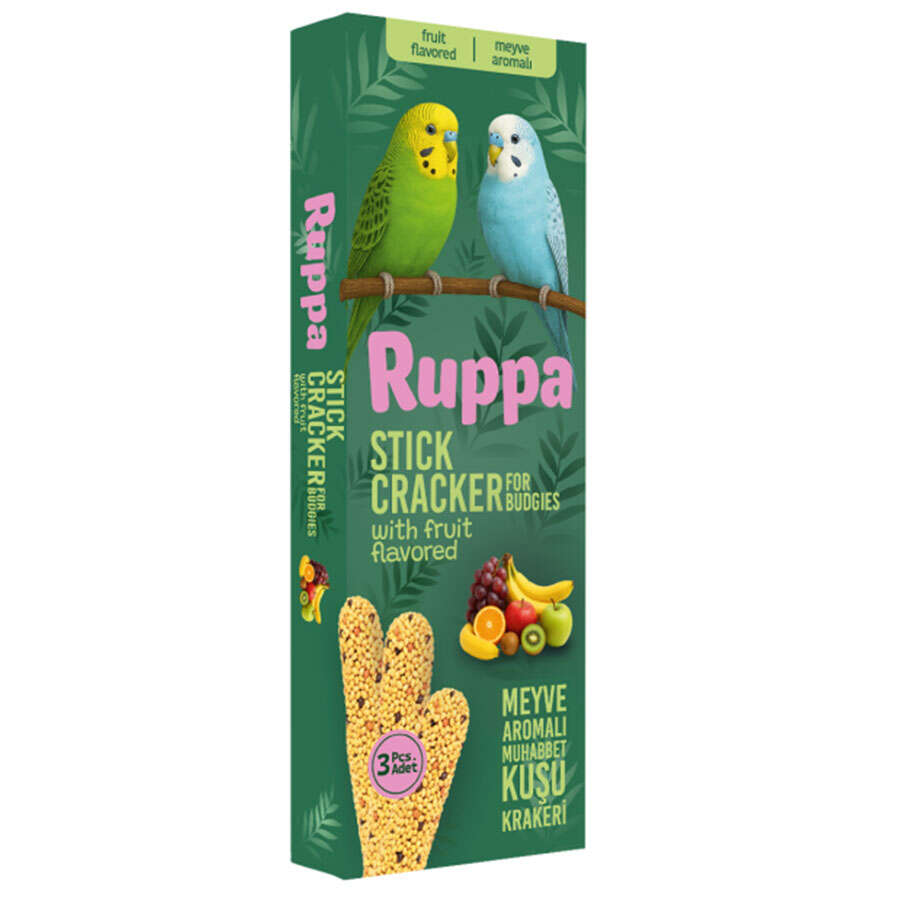 Ruppa Stick Cracker Meyve Aromalı Muhabbet Kuşu Krakeri, muhabbet kuşlarının doğal beslenme alışkanlıkları ve lezzet tercihleri dikkate alınarak özenle hazırlanmış, eğlenceli ve lezzetli bir ödül yemidir. Meyve aromasıyla zenginleştirilen özel içeriği sayesinde kuşlar tarafından severek tüketilir ve günlük beslenmeye keyifli bir çeşitlilik kazandırır.