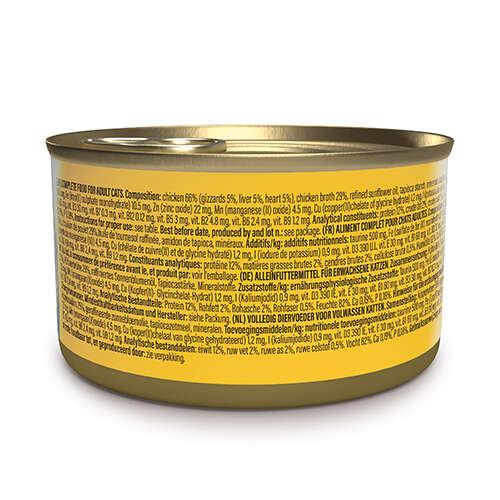 Tavuk %66 (taşlık %5, karaciğer %5, kalp %5), tavuk suyu %29, rafine ayçiçek yağı, tapyoka nişastası, mineraller.