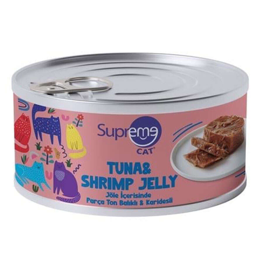 Supreme Cat Jöle İçerisinde Parça Ton Balıklı & Karidesli, kedinizin günlük beslenmesine katkı sağlamak için özel olarak formüle edilmişitir. %35 ton balığı ve %8 karides içeriğiyle kedinizin damak tadına hitap eder ve her öğüne lezzetli bir çeşitlilik katar.