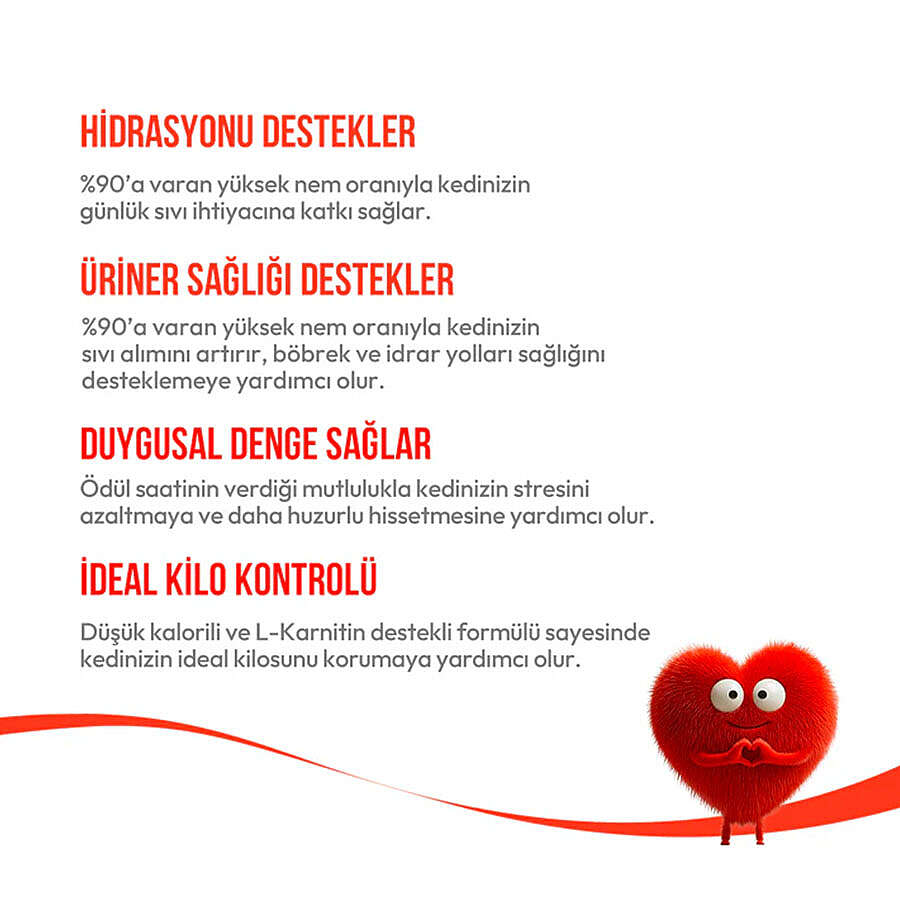 Hindi ve kızılcığın zengin formülü; ideal kilo yönetimini destekleyen L-Karnitin ilavesiyle güçlendirilmiştir. Geliştirilmiş emülsiyon teknolojisi sayesinde elde edilen ipeksi kıvamı, kızılcığın doğal antioksidan etkisiyle birleşerek idrar yolu (üriner sistem) sağlığını korumaya yardımcı olurken; ödül saatinin verdiği mutlulukla kedinizin duygusal dengesini destekler.