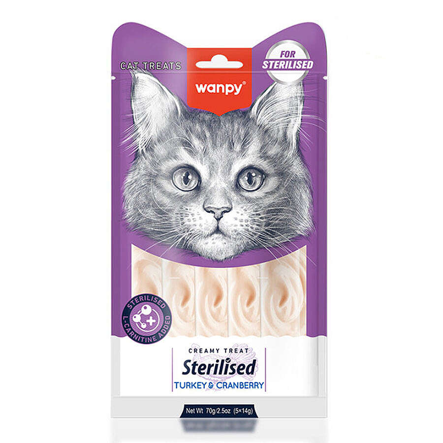 Wanpy Hindi ve Kızılcıklı Kısırlaştırılmış Kedi Krema Ödül Maması, %100 gerçek et içeriğiyle kısırlaştırılmış kediler için özel olarak geliştirilmiş bir formülasyona sahiptir.