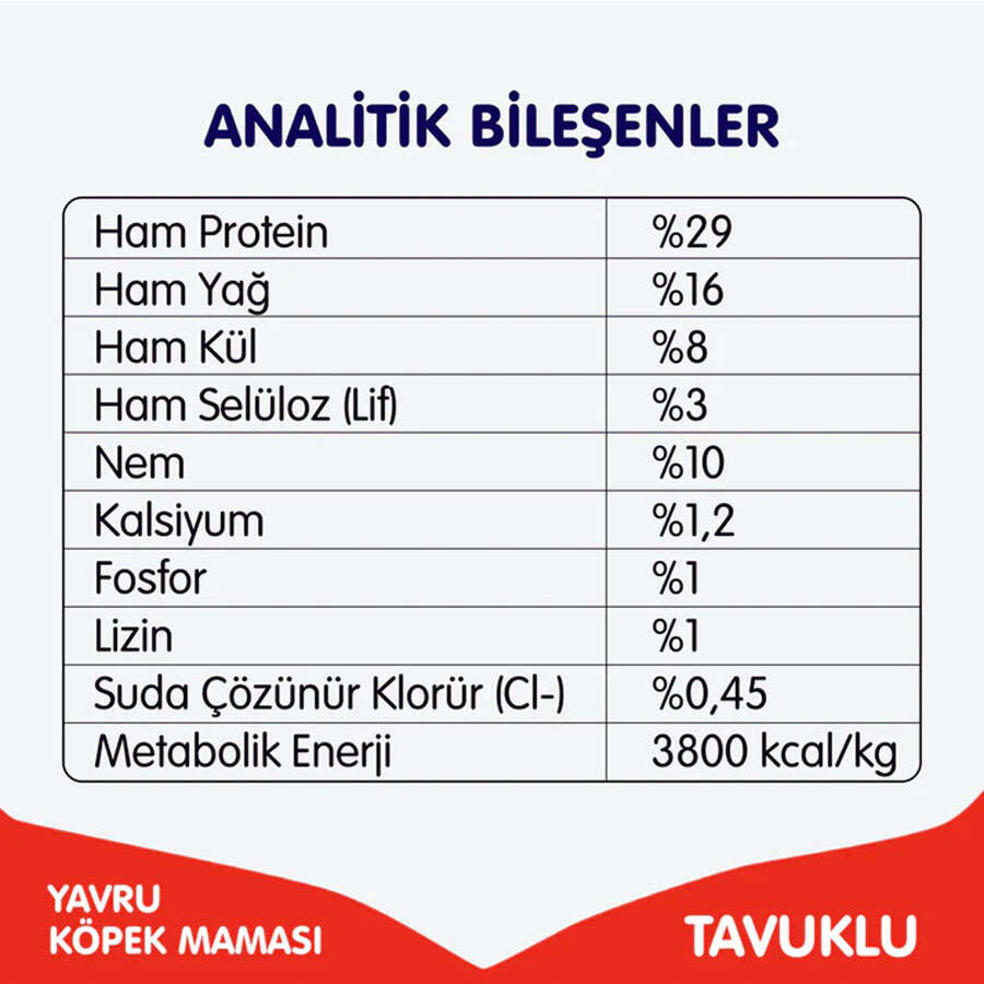 Yavru köpeğinizin günlük enerji ve besin ihtiyacı; yaş, kilo ve aktiviteye göre değişebilir. Paket üzerindeki besleme tablosunu takip ediniz, temiz içme suyu sürekli bulundurunuz.