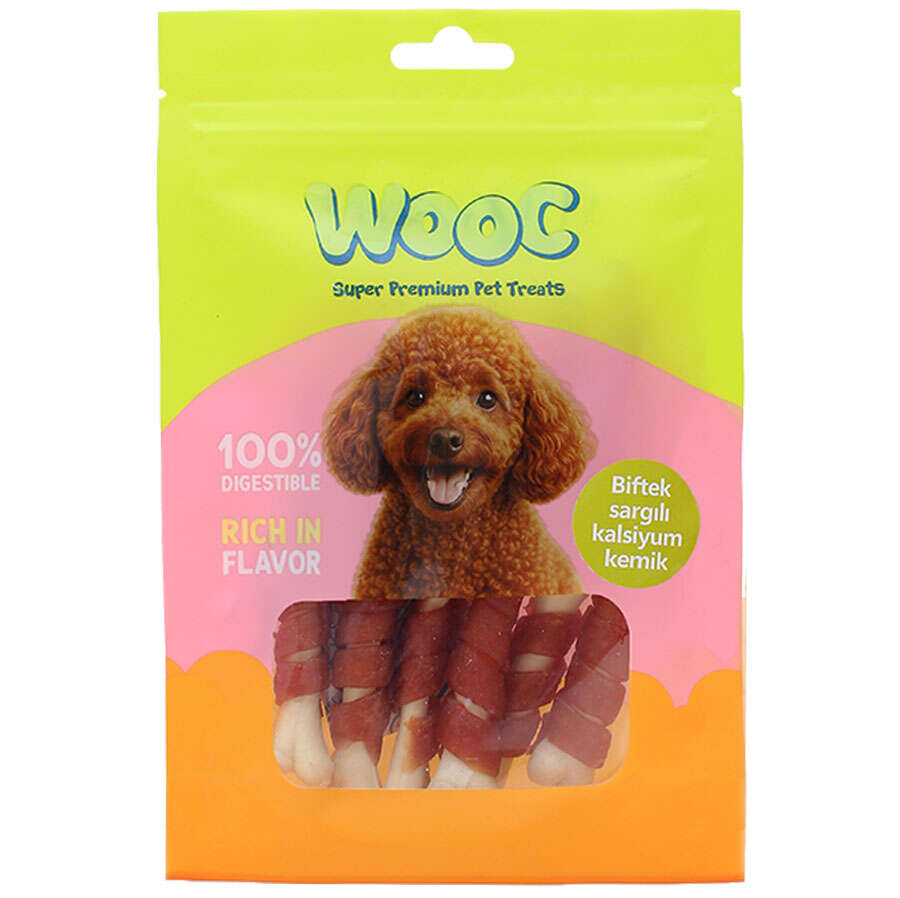 Wooc biftek sargılı kalsiyum kemikli ödül.İçindekiler dana eti %38.5 , mısır nişastası %55, sorbitol %5, gliserin %5, tuz %0,5.